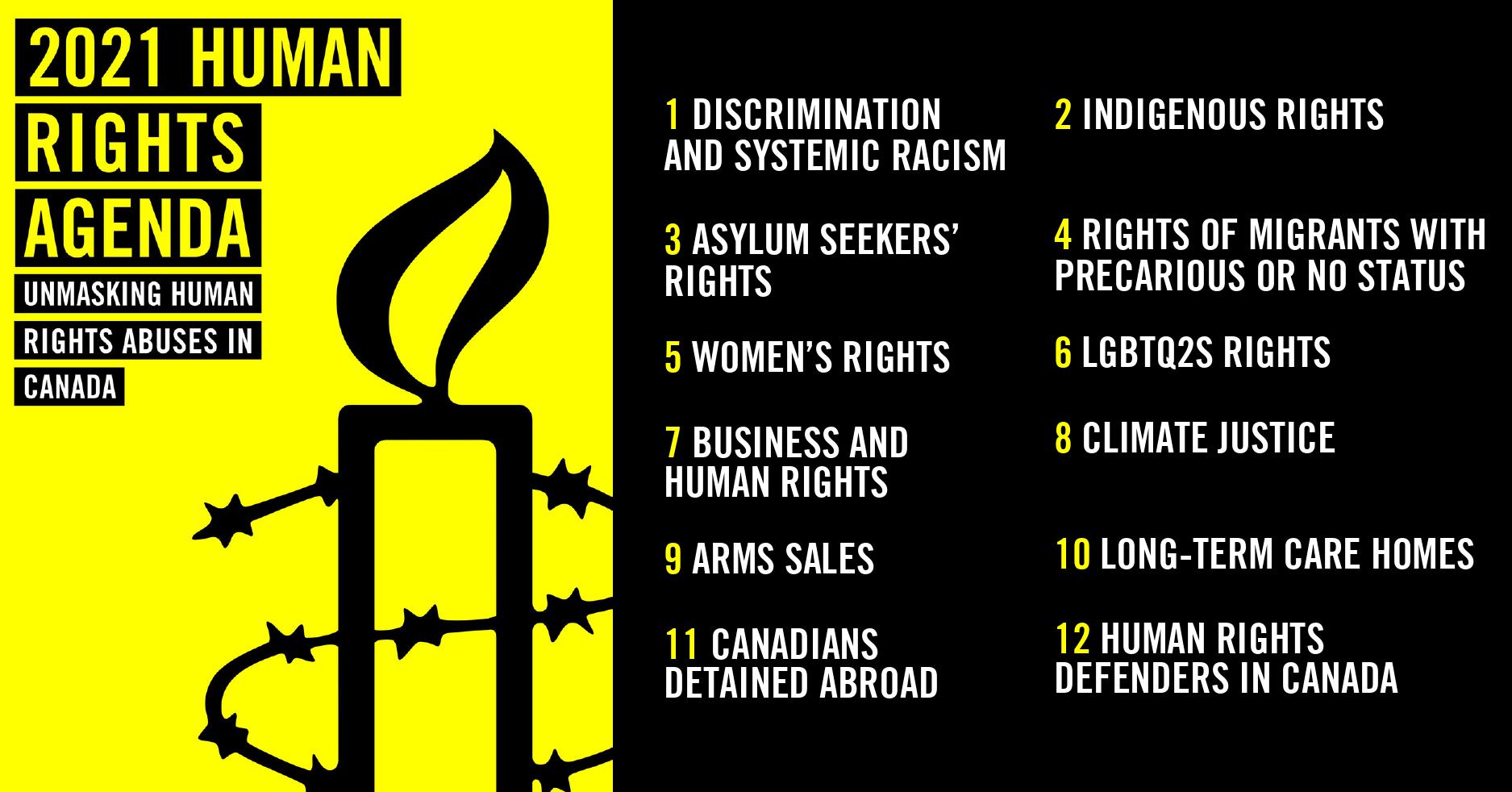 Our 2021 Human Rights Agenda for Canada proposes recommendations for action in twelve areas: