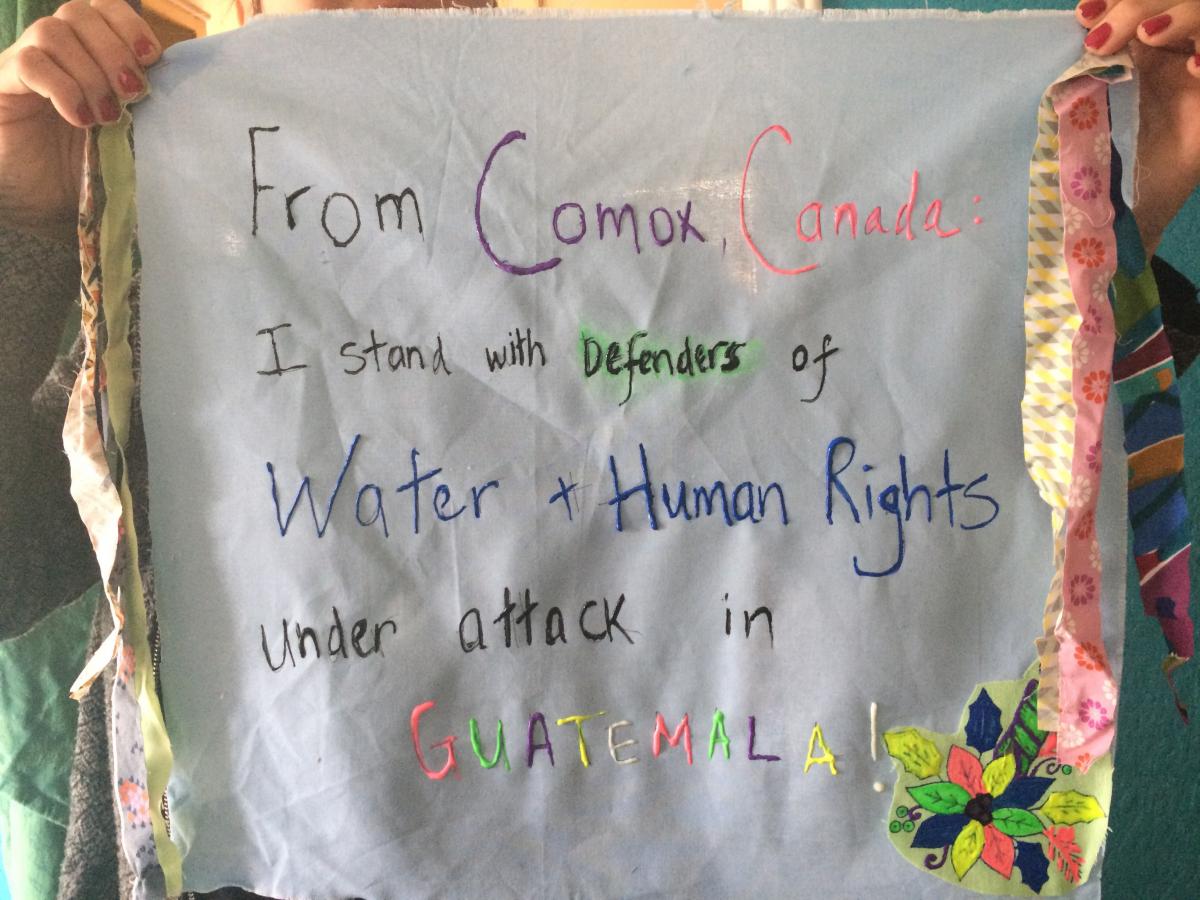 - Use the strips of cloth to create TWO separate eye-catching messages of support for water defenders in Guatemala and Honduras respectively. Be sure to mention Canada! Add your name to add weight.
