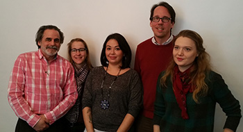 | Helen Knott, center, with Ed Bianchi, KAIROS; Julie Delahanty, Oxfam Canada; Craig Benjamin, Amnesty International Canada; and Sarah McCue, Canadian Federation of Students |